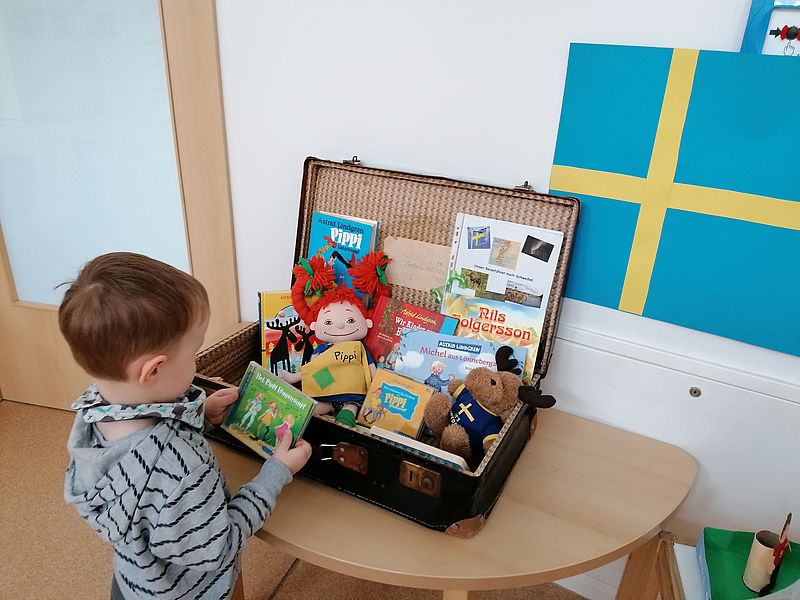Los ging es am Freitag, den 06.03.20, da bekamen wir einen wundersamen Koffer. Als wir den Koffer öffneten, hörten wir eine bekannte Melodie und viele Dinge aus dem Land, von dem wir in der Woche noch vieles mehr erfahren sollten, waren in dem Koffer – Pippi Langstrumpf, ein Elch, Bücher von Astrid Lindgreen, Musik und eine Postkarte mit der Einladung Schweden zu besuchen.