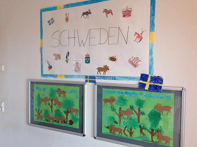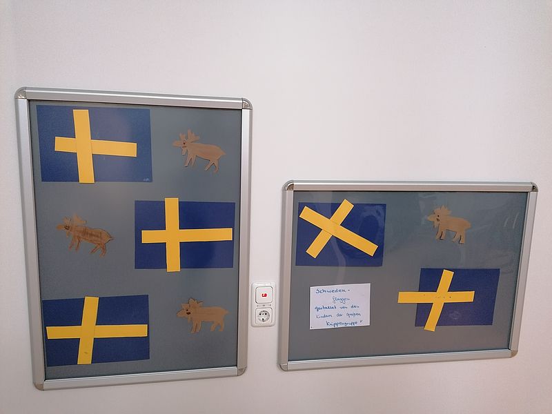 Zur Vorbereitung malten die Kinder die schwedischen Flaggen und gestalten das Atrium damit.