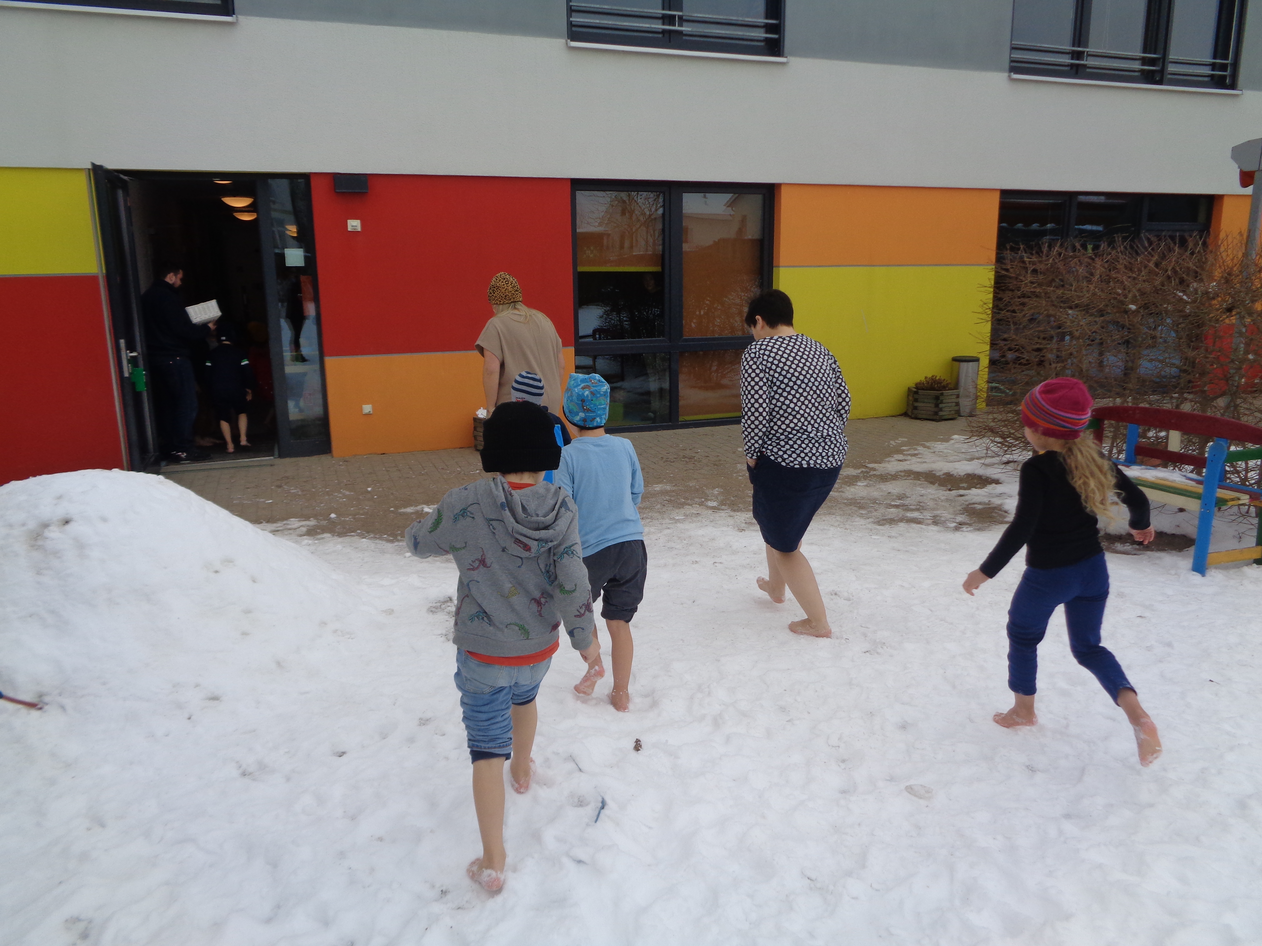 Um unsere Abwehrkräfte nicht nur mit Kneippanwendungen wie z.B. Wassertreten oder mit Armbädern zu stärken, trauten wir uns für kurze Zeit barfuß in den kalten Schnee. Frau Wieloch nahm unsere Einladung gerne an und "kneippte" eifrig mit. Das war ein großer Spaß!