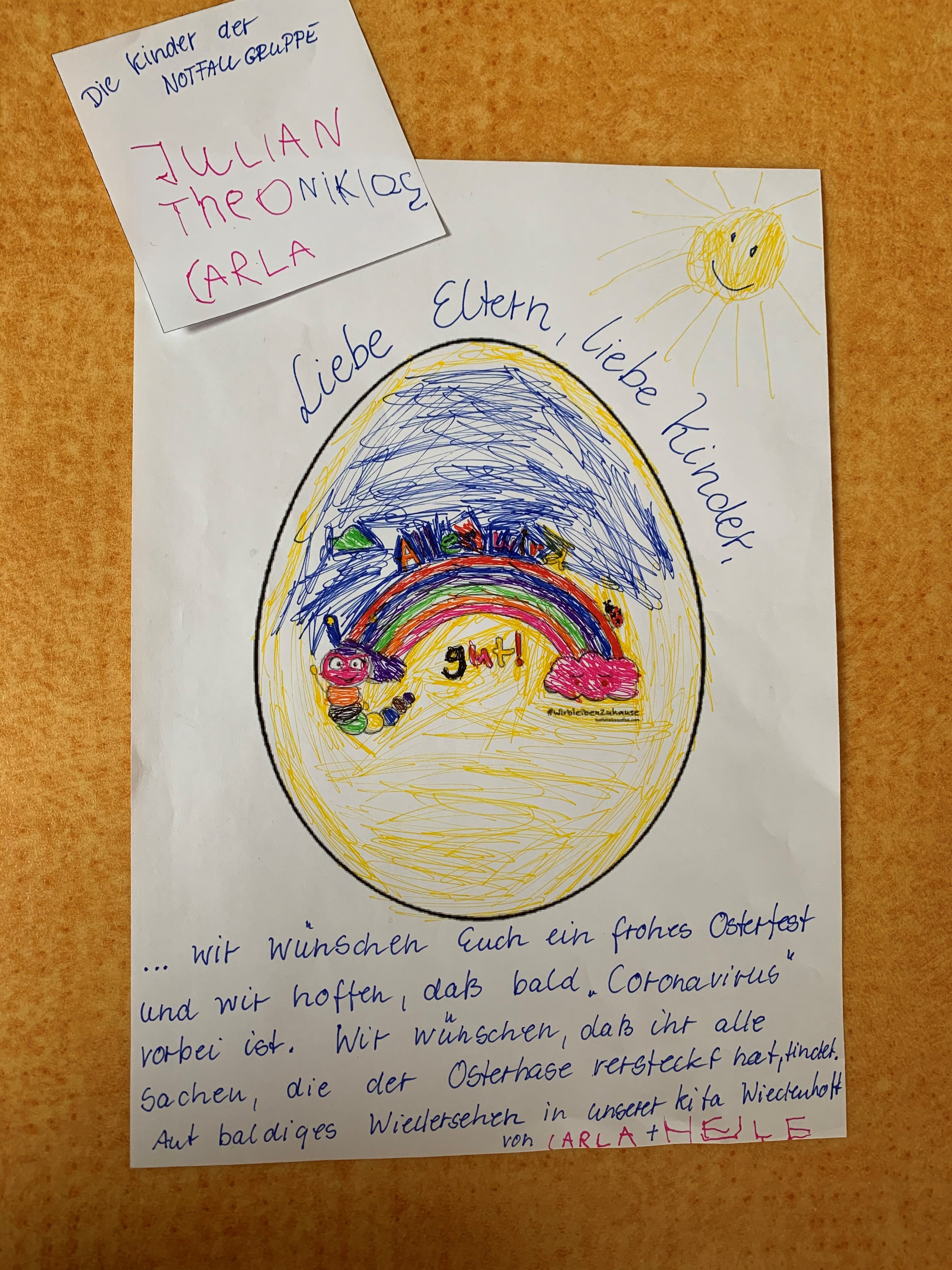 Wir vermissen das Lachen unserer Kitakinder und freuen uns auf eine Zeit, in der unser Haus wieder mit Leben gefüllt ist.Wir wünschen Ihnen eine frohe Osterzeit in gemütlicher Häuslichkeit.