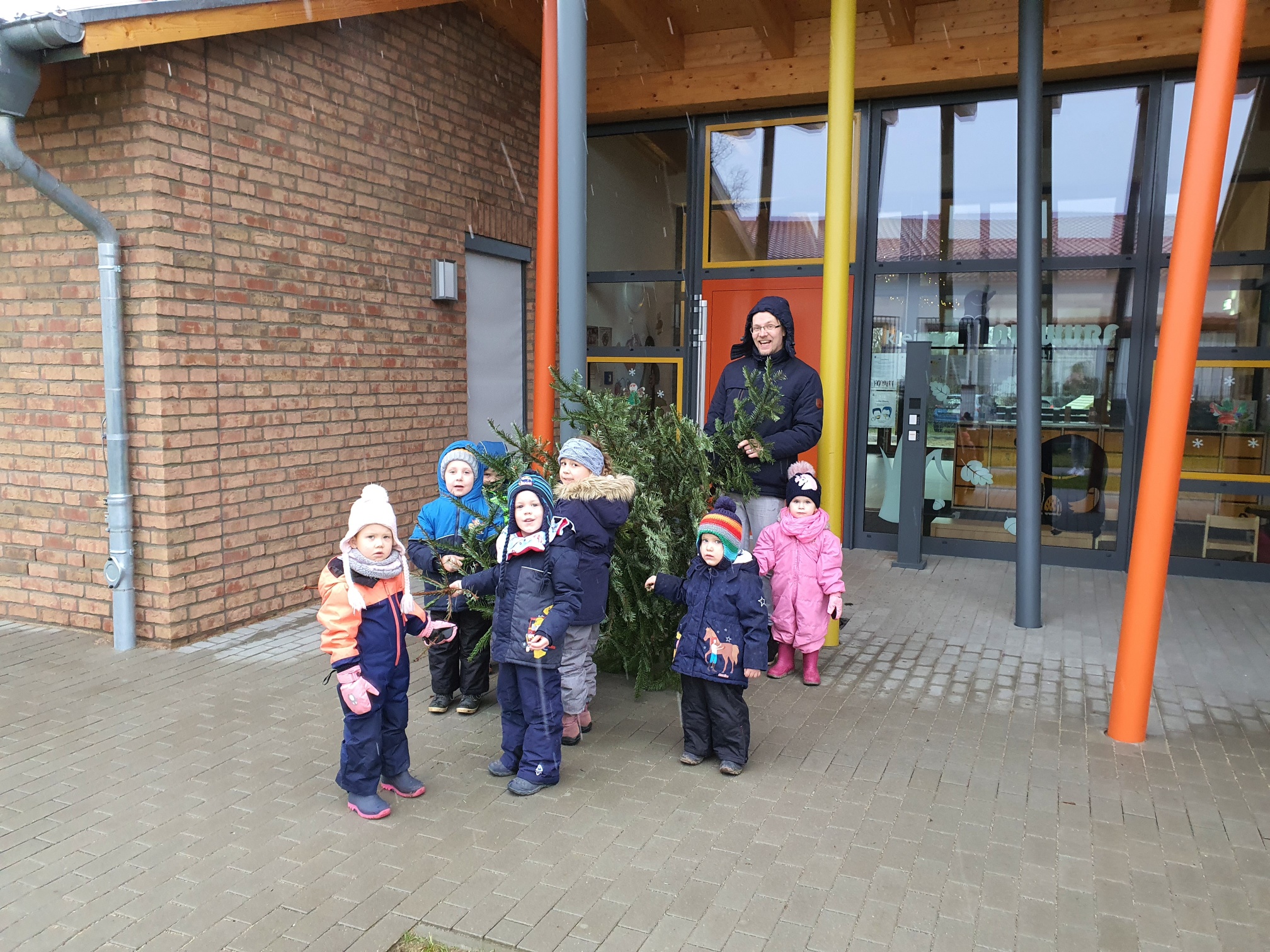 Die Kinder der Kita „Kleiner Maulwurf“ tragen tatkräftig den Weihnachtsbaum heraus und freuen sich schon sehr auf das kommende Jahr.