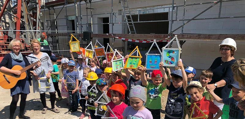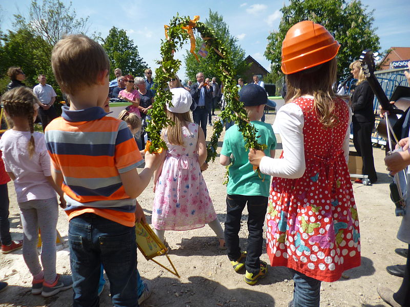 Am 24.05.2019 war es endlich soweit. Der letzte symbolische Nagel wurde ins Gebälk geschlagen. Mit großen Augen bestaunten die Kinder des Kinnerhuuses den Fortschritt des Baugeschehens an ihrem neuen Kita-Haus. Mit Liedern im Gepäck, einem selbstgedichteten Richtspruch und kleinen Kunstwerken in Form von Kränzen und Zollstockhäusern feierten wir gemeinsam mit vielen Gästen diesen wichtigen Meilenstein in unserer Bauchronik.