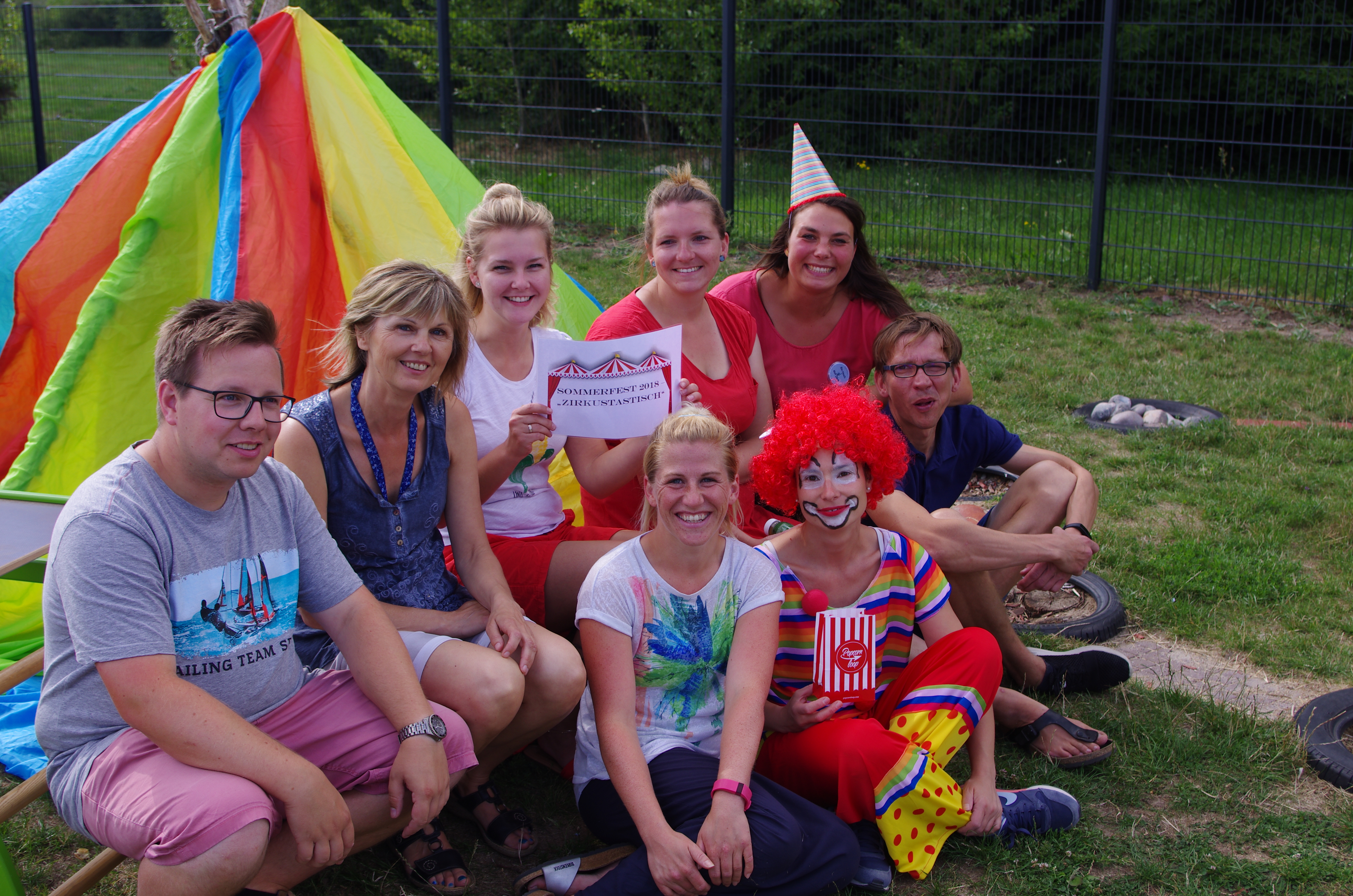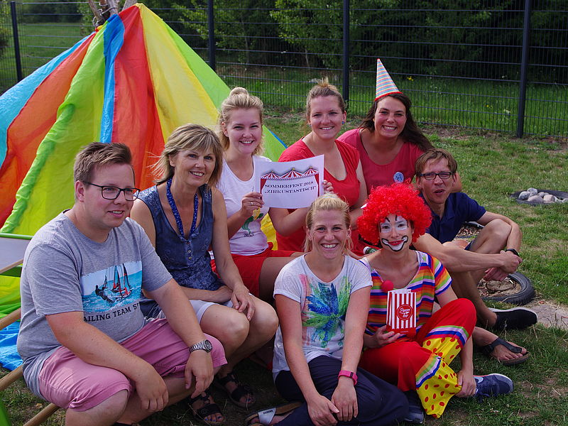 Das Wetter war wieder einmal bombastisch und die Stimmung erst recht. Alle Gruppen präsentierten ein tolles Zirkusprogramm. Die kleinsten Löwen sprangen durch einen Feuerreifen, es wurde getanzt, jongliert und auch die Reiterinnen und Akrobaten zeigten ihr einstudiertes Programm. Zum Abschluss bespaßte uns der Clown mit einer tollen Showeinlage und gemeinsam sangen wir das selbstkomponierte "Zirkuslied" nach der Melodie "Wer will fleißige Handwerker sehn". Das Sommerfest wurde mit einer Konfettikanone eröffnet und Brezeln und Popcorn wurden liebvoll mit selbstgebastelten Bauchläden verteilt. An der Bastelstation entstanden schöne Zirkuspferdchen und an der Fotostation wurde lustig posiert. Der Clown zeigte tolle Luftballontricks und ließ Kinderherzen höher schlagen.