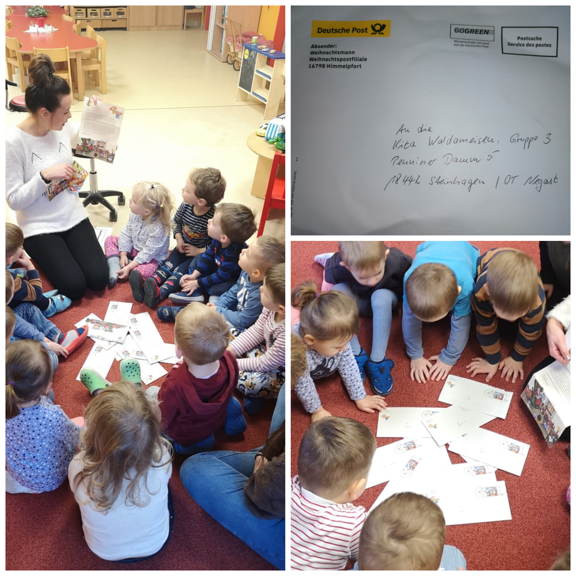 Die Kinder der Gruppe 3 haben fleißig einen großen Wunschzettel für den Weihnachtsmann gemalt und gebastelt. Unterschrieben hat jedes Kind mit seinem Fingerabdruck. Gemeinsam mit Frau Gladrow und Frau Westphal wurde der Wunschzettel vor einiger Zeit dann direkt zum Weihnachtsmann geschickt. Ganz erstaunt waren die Kinder, als ein großer dicker Brief vom Weihnachtsmann im Briefkasten des Kindergarten´s steckte. In dem großen Brief waren viele kleine Briefe, für jedes Kind ein Brief. Vielen Dank lieber Weihnachtsmann :)