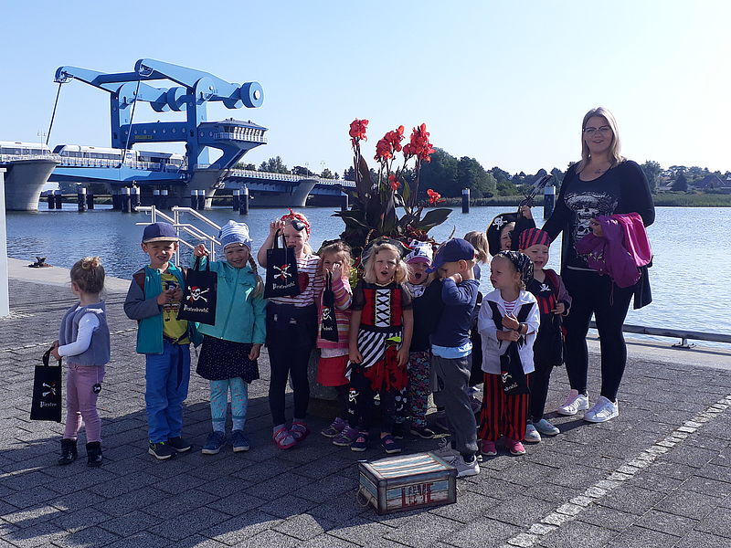 Diese startete morgens an der Kita Tausendfüßler in Karlsburg und führte die Kinder zuerst zum Bahnhof! Von da aus ging es los Richtung Wolgast, dort angekommen wurden die Kinder schon von einem echten Pirat in Empfang genommen.