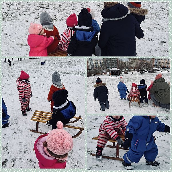 Auch die Kleinsten, der Kita "Klein und Groß", strahlten bei dem Anblick des Schnees. Da sie leider noch nicht an der Schneeballschlacht der Großen teilnehmen konnten, machten sich die "Strandschnecken" kurzerhand auf den Weg um sich Schlitten zu besorgen. Gesagt, getan und sie machten sich mit diesen auf den Weg durch Groß Klein. Jeder durfte mal auf dem Schlitten sitzen oder ihn ziehen..."Wer ist wohl die stärkste Schnecke?". Was darf bei einer Schlittenfahrt nicht fehlen?..genau das Rodeln bergab und auf einem kleinen Berg machten unsere Schnecken ihre ersten Rodelversuche. Die Kleinen genossen den Tag im Schnee und können ihre nächste Fahrt auf dem Rodelschlitten nicht erwarten.