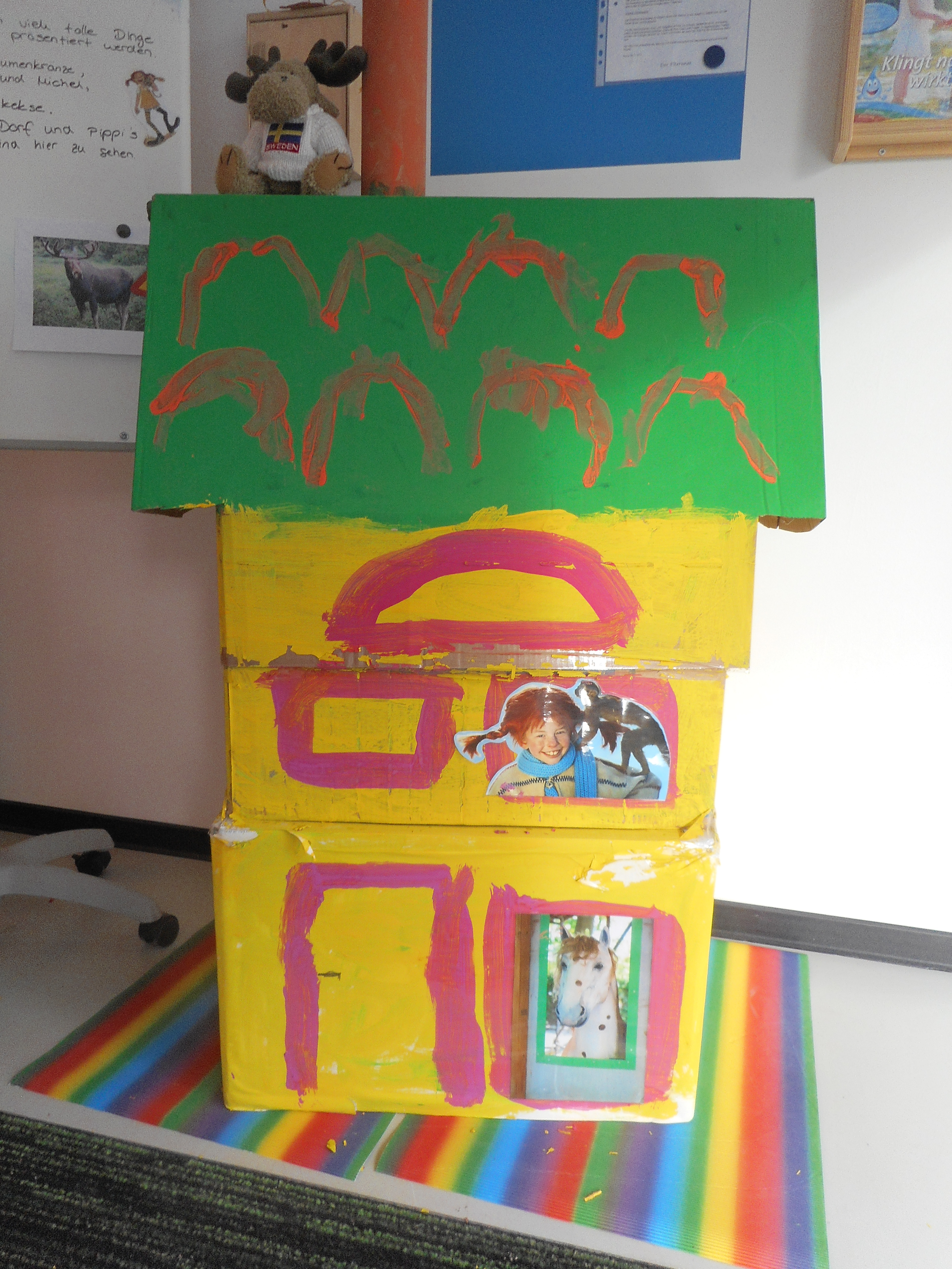 Ohne Astrid Lindgren ging es natürlich auch im Kindergarten nicht, so haben die Kinder eine „Villa Kunterbunt“ aus Pappkartons gebaut und die Geschichten von „Pippi“ und dem „Michel aus Lönneberga“ kennengelernt.