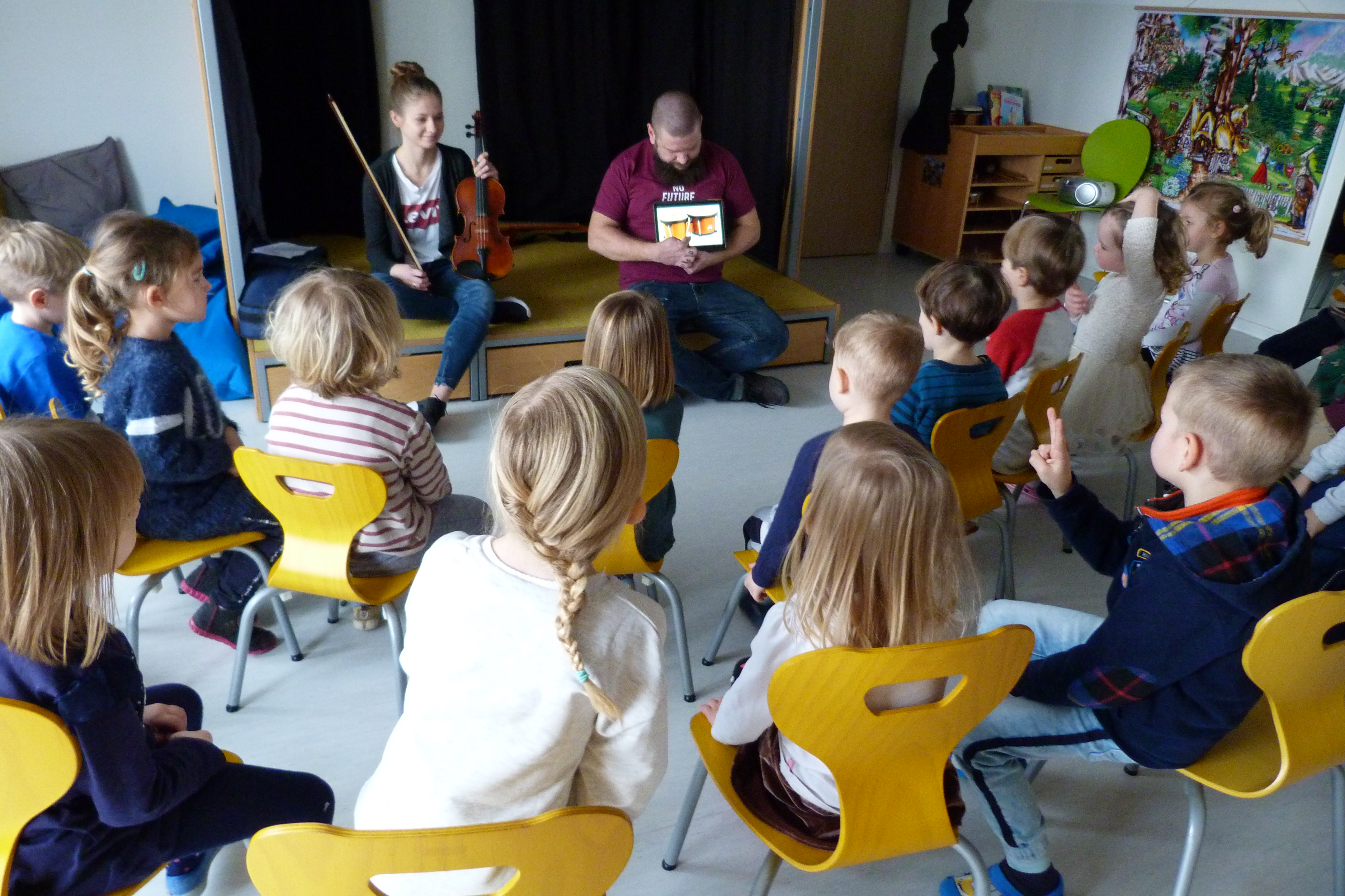Wir starteten mit dem altbekannten Winterlied „Schneeflöckchen, Weißröckchen“, welches unsere Praktikantin Phelina uns auf der Geige präsentierte. Mit einem Quiz und dem eigenständigen Ausprobieren verschiedenster Musikinstrumente stimmten wir uns auf unser Thema ein.