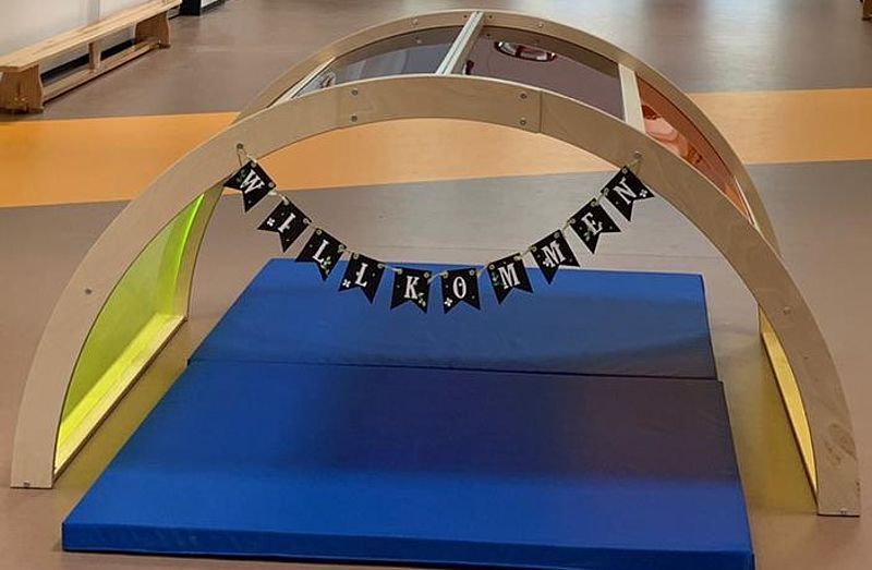 Auch die Mitarbeiter/innen des Kindergartens sind angetan von ihrem neuen Umfeld. „Die Helligkeit der Räume“ beeindrucken sie. In der Tat herrscht in den von Tageslicht durchfluteten Räumen mit den hohen Decken eine besondere Wohlfühlatmosphäre. Der breite und lange Eingangsbereich bietet den Mädchen und Jungen genügend Platz zum Spielen und Bewegen. Jede Gruppe hat einen eigenen Raum nebst Garderobe und Sanitärbereich. Außerdem gibt es vier Funktionsräume (Atelier, Musik- und Theaterraum, Bauraum, Natur- und Umweltraum), sowie eine Kinderküche und eine Sauna.