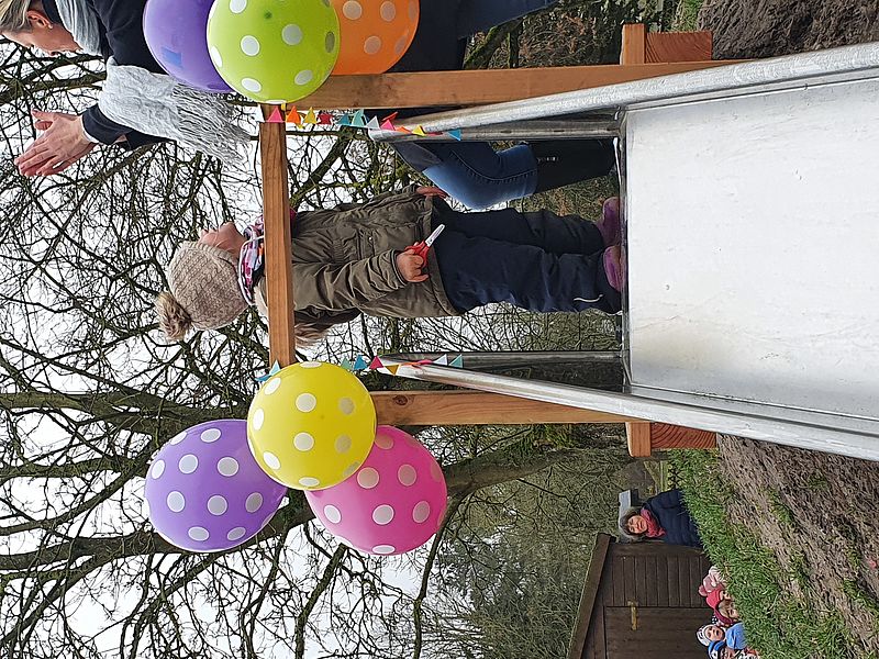 Wir durften endlich hoch auf den Berg zum Rutschen! Aber vorher wurde diese noch feierlich eröffnet und das Absperrband wurde durchtrennt. :-)
