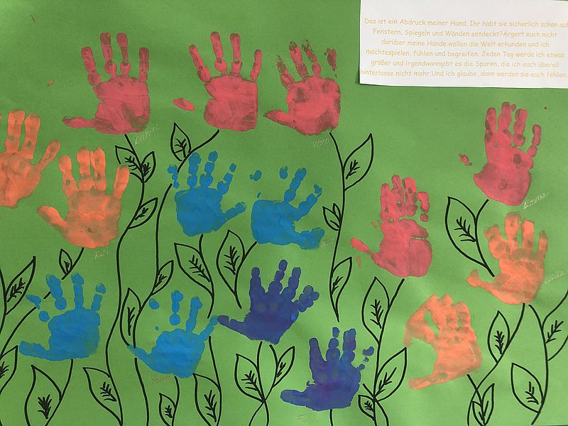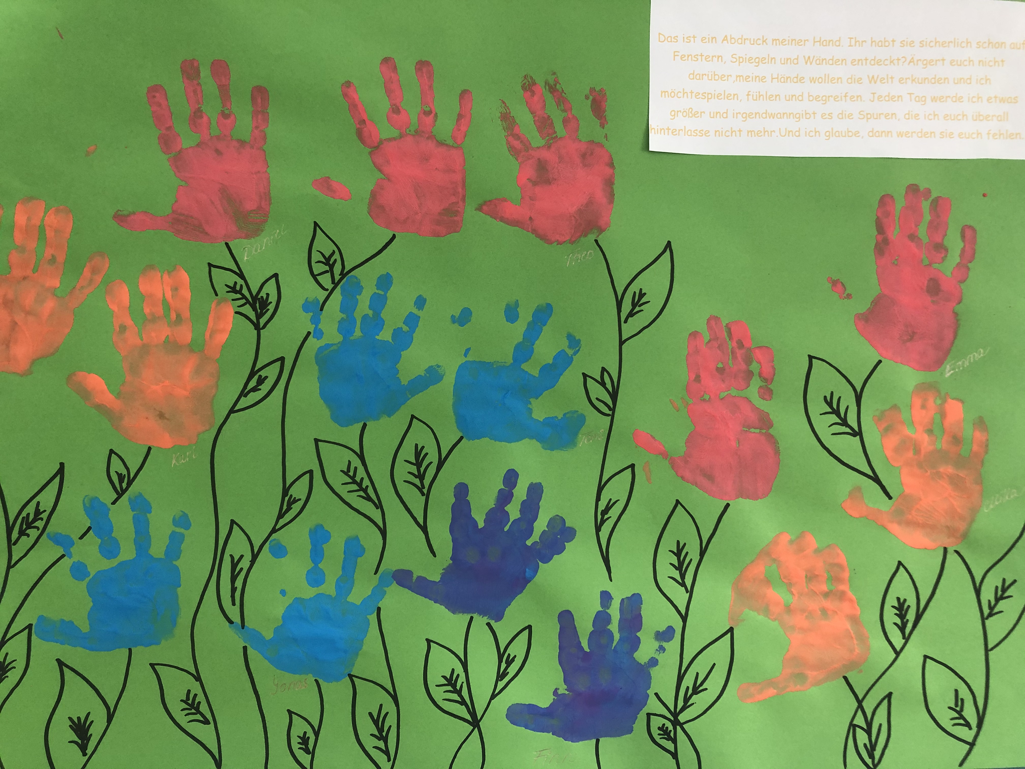 In unserer Kinderkrippe beobachten die "Leichtmatrosen" derzeitig ganz intensiv das das Frühlingserwachen. Daher treffen sie uns momentan vorrangig im Außenbereich an. Frühblüher stecken ihre Köpfchen aus der Erde, erste Knospen sprießen und das Gras beginnt langsam von seinem Winterschlaf zu erwachen. Auch die Feuerwanzen auf dem Hof faszinieren unsere Kinder. Auf langen Spaziergängen entdecken wir die Welt um uns herum und genießen die ersten warmen Sonnenstrahlen. Vertiefend dazu setzen wir uns mit Themenbereichen wie "Vom Samen zur Pflanze" auseinander. Auch die derzeitige Frühblüherpracht auf unserem Gelände hielten wir direkt mit bunten Handabdrücken auf einem gemeinsamen großen Plakat fest.