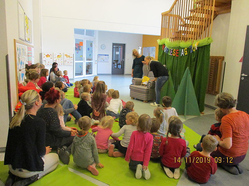 Alle Kinder der Kita machten es sich in unserer großen Halle gemütlich und warteten gespannt auf unseren Besuch an diesem Tag!