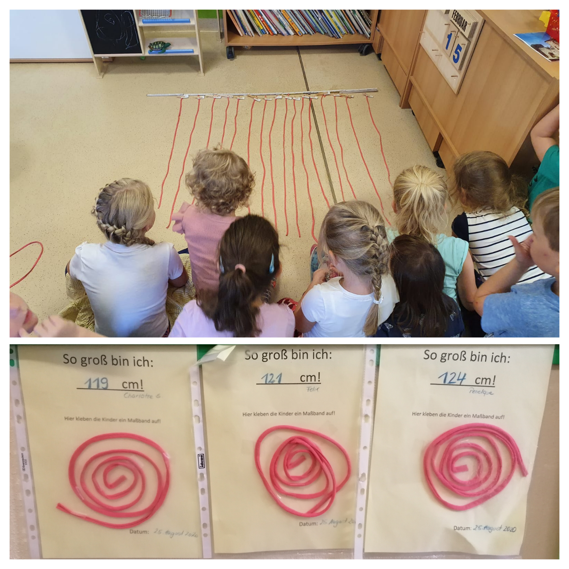 Passend zum aktuellen Thema "Ich und mein Körper" messen unsere Vorschulkinder ihre Körpergröße. Dann geht es in den dirketen Vergleich: Wer ist wohl am Größten? Gibt es Kinder die gleich groß sind? Beim Auslegen der Schnur gehen wir dem Geheimnis auf die Spur.