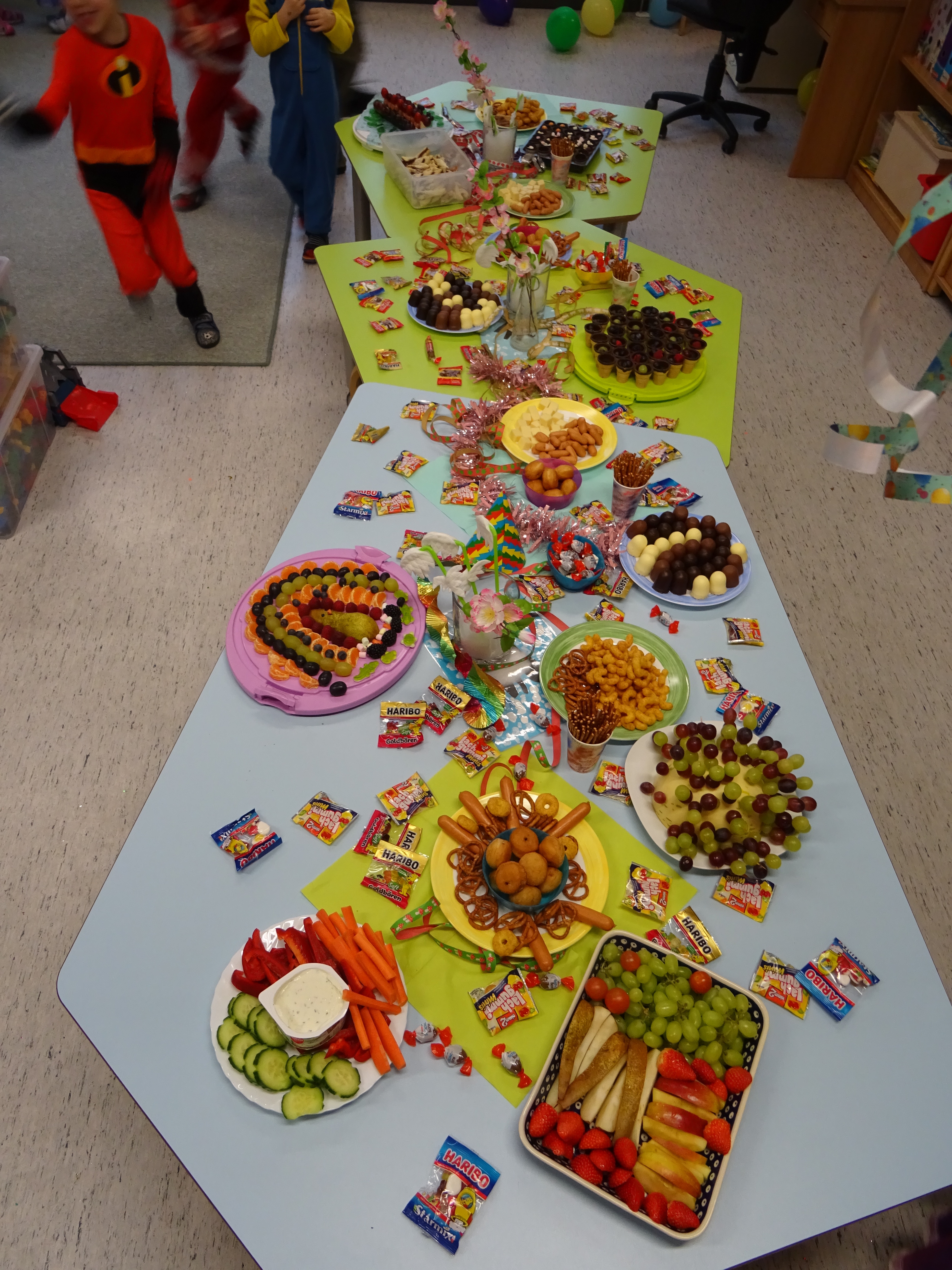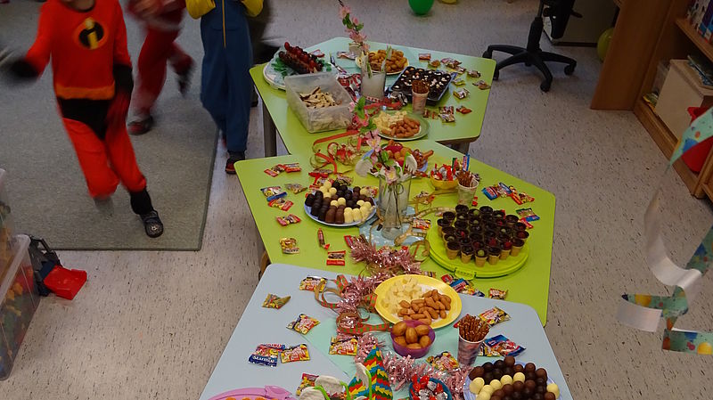 Der erste Monat des neuen Jahres endete für die Kinder der Kita "Am Schulcampus" mit einem phänomenalem Faschingsfest! Mit einem kunterbunten Programm, lauter Karnevalsmusik, gutem Essen und vielen strahlenden Kindergesichtern, genossen wir den Tag in vollen Zügen und werden dieses Fest noch lange in toller Erinnerung behalten. Schon am frühen Morgen wurden die kostümierten Kinder in freudiger Erwartung mit Partymusik, viel Konfetti, bunten Luftschlagen und knalligen Luftballons begrüßt. Auch das Frühstück konnte sich sehen lassen, denn kleine Berliner, Würstchen und Salzbretzeln warteten darauf Platz in den hungrigen Kinderbäuchen zu finden. Nach dem ausgiebigen und außergewöhnlichen Frühstück, versammelten sich alle Kinder im Raum der Wieselkinder und gegannen das Faschingsfest mit fröhlichen und bekannten Partyliedern und anschließender Modenschau. Im Anschluss stürmten die Kinder das grandiose Festtagsbuffet, welches keine Kinderwünsche offen ließ und für große Augen sorgte. Auch eine Kinderdisco mit Discokugel, viel Konfetti und Luftschlangen, wartete auf die Kinder. Auch eine Malstation und eine Fotoecke konnten die Kinder ausgiebig nutzen und hatten jede Menge Spaß dabei! Nachdem sich alle Kinder satt gegessen und in der Kinderdisco ausgelassen getanzt hatten, starteten wir mit einer langen Polonaise durch das Schulhaus, mit dem Ziel den Bewegungsraum der Grundschule zu erreichen. Auch dort konnten die Kinder ihrer Bewegungsfreude bei verschiedenen Parcours nachgehen. Neben Dosenwerfen, Eierlauf und Sackhüpfen, konnten sich die Kinder ausgelassen und fröhlich tanzend durch den Raum bewegen und ihre Kostüme stolz präsentieren.