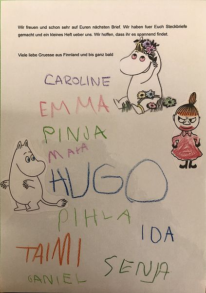 Im Briefumschlag fanden auch wir große Steckbriefe jedes einzelnen Kindes der Gruppe. Zu unserer Überraschung sind in der Riesengruppe 21 Kinder, die von 3 Erziehern betreut werden. Sie schrieben in ihrem Brief so einiges über ihren Alltag. Wenn es im Winter kalt wird, dürfen sie ab -20 Grad Celsius nicht mehr lange draußen spielen. Auch in Finnland ist Corona angekommen und leider dürfen die Kinder dort auch einige Angebote und Pläne nicht umsetzen. Ausflüge nach Helsinki sind im Moment nicht möglich.