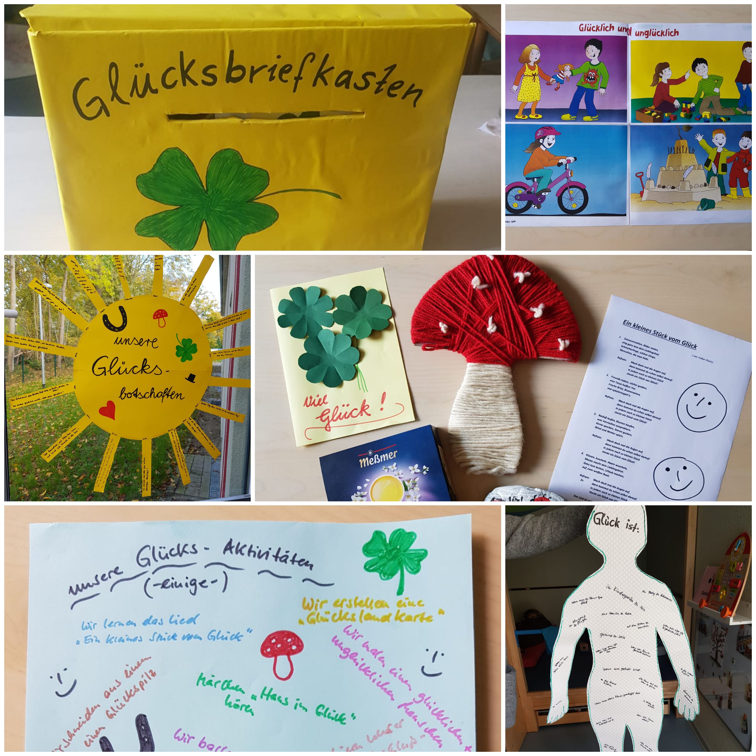 Wo fängt man da eigentlich an? Eine Möglichkeit ist z.B. das Umfeld zu befragen, was andere Menschen glücklich macht. Dafür wurde eigens ein Glücksbriefkasten und eine Glückstafel für die Familien gebastelt und Mitmachaufträge verteilt, eingesammelt und anschließend ausgewertet. Natürlich musste auch das eigene ich abgeklärt und definiert werden - was ist Glück für jeden persönlich? Dabei kam es innerhalb der Gruppe zu höchst philosophischen Gesprächen und Ansichten, die die Kinder auch Zuhause mit der Familie fortsetzten. Dabei lernten wahrscheinlich zu diesem Thema nicht nur die Rückenkrauler Verständnis für sich und andere aufzubringen, wenn jemand glücklich, oder auch mal unglücklich ist.