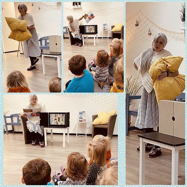 Heute durften sich die Kinder die Kita "Klein und Groß" über Besuch von "Frau Holle" freuen. Sie hatte nicht nur Schnee dabei, sondern brachte auch das japanische Erzähltheater "Kamishibai" mit. Was ist das?...Das Kamishibai ist nicht einfach nur ein Bilderrahmen! Es ist ein kleines Theater, das seinen Platz in Gruppenräumen, auf Küchentischen, in Klassenzimmern, auf Gartenbänken und an vielerlei Orten mehr findet. Wo auch immer es eingesetzt wird, vermag es das Publikum in seinen Bann zu ziehen. Wenn der Erzähler plötzlich die beiden Türchen öffnet und die Geschichte auf Bildern erscheint, dann wird aus dem Kamishibai das Erzähltheater. Und das tat auch "Frau Holle", sie fesselte die Kinder, mit ihrer Geschichte von der "Goldmarie" und der "Pechmarie". Zum Schluss wünschten sich alle von "Frau Holle" das es auch bei uns endlich schneit.
