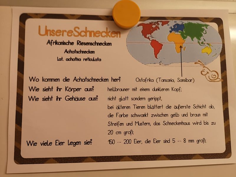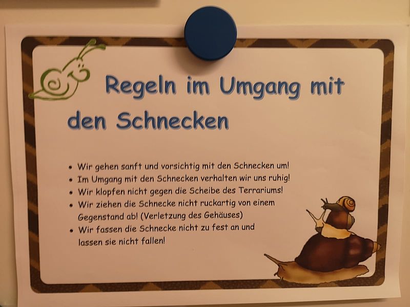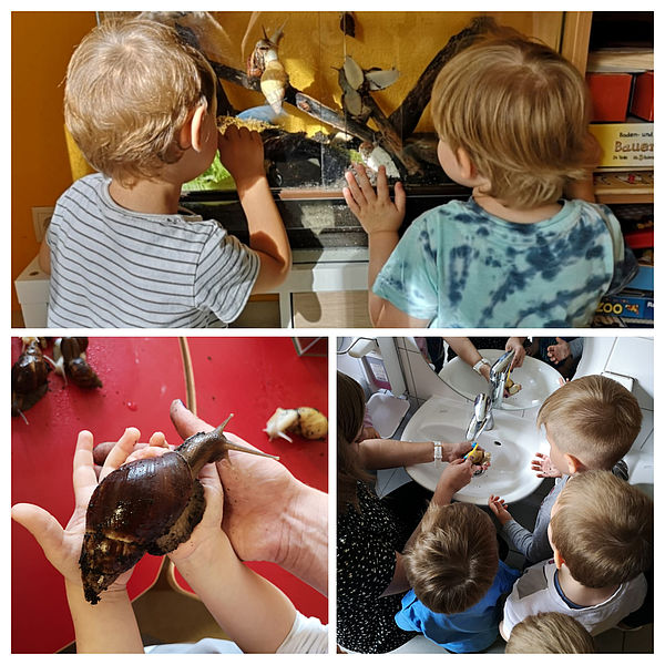 Seit gestern wohnen in der Gruppe 3 der Kita "Waldameisen" ein paar neue Bewohner, die auf die Namen "Coco", "Mascha" und "Golliath" hören. Es handelt sich um Afrikanische Reiesenschnecken, auch Achatschnecken (Achatina fulica) genannt. Die Achatschnecken gehören zu den größten Landschnecken der Welt. Ursprünglich kommen sie aus den tropischen Gebieten Afrikas und lieben den feuchten und warmen Boden. Sie sind Pflanzenfresser und mögen vor allem Obst und Gemüse wie z.B. eine saftige Gurke, Salat, Birnen oder auch Mango und Süßkartoffel. Im Rahmen der tiergestützen Pädagogik sollen die Kinder lernen durch die tägliche Pflege der Schnecken, Verantwortung zu übernehmen und sozial zu handeln. Die Achatschnecken wirken durch ihre Ruhe und Langsamkeit sogar auf sehr aktive Kinder beruhigend. Gemeinsam mit den Erziehern wurde das Terrarium vor dem Einzug der Schnecken mit Erde befüllt und eingerichtet. Viele der Kinder haben sich bereits am Wochenende gemeinsam mit ihren Eltern über Achatschnecken infomiert und konnten schon einiges über die neuen Mitbewohner erzählen. Die Achatschnecken sollen fester Bestandteil unserer Einrichtung werden. Die Kinder sollen sie als stetigen Freund, Unterstützer und Begleiter des Kindergartenalltags mit allen Höhen und Tiefen sehen und behandeln.