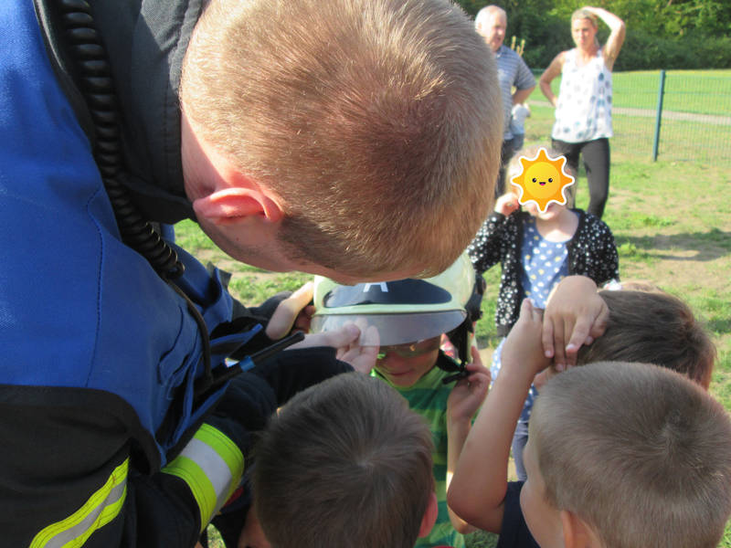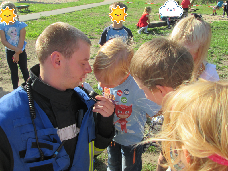 Anschließend konnten die Kinder, die Feuerwehrmänner mit Fragen Löchern, den Feuerwehrhelm aufsetzen, und auch mal ins Funkgerät sprechen!