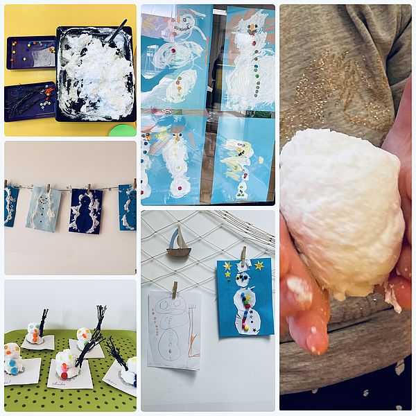 In der Kita "Klein und Groß" ist der Schneemann in jeder Gruppe eingekehrt und das auf ganz viele verschiedene Art und Weisen. Die "Strandblumen" haben ihn mit selbstausgeschnittenen Kreisen aufgeklebt, Hilfe von kreisförmigen Untersilien oder frei Hand gezeichnet. Die "Seemöwen" haben den Schneemenschen mit einer Schablone getupft. Die "Wasserschildkröten" wollten gerne einen Schneemann für zuhause und haben mit Rassierschaum und Natron ihren eigenen Schnee hergestellt und daraus einen geformt und ihn mit Knöpfen und Stoffkugeln dekoriert. Und das sind nur einige Beispiele, es gibt noch viele andere Möglichkeiten den süßen Schneemann "lebendig" werden zu lassen.