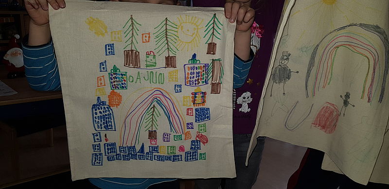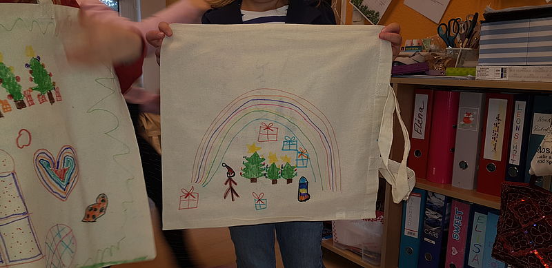 Schnell stand für uns fest: Wir helfen beim weihnachtlichen Bemalen der Stoffbeutel.