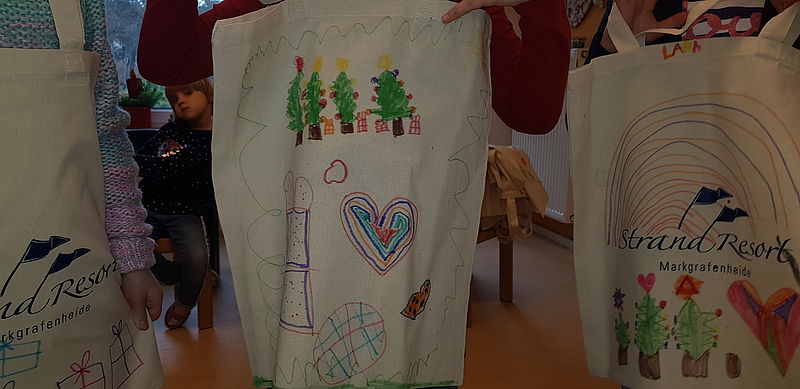 Das Hotel "Strand Resort" hatte Herrn Krostitz Stoffbeutel gesponsert, indenen die Weihnachtsgaben verschenkt werden sollten. Aber die Beutel sahen gar nicht weihnachtlich aus!