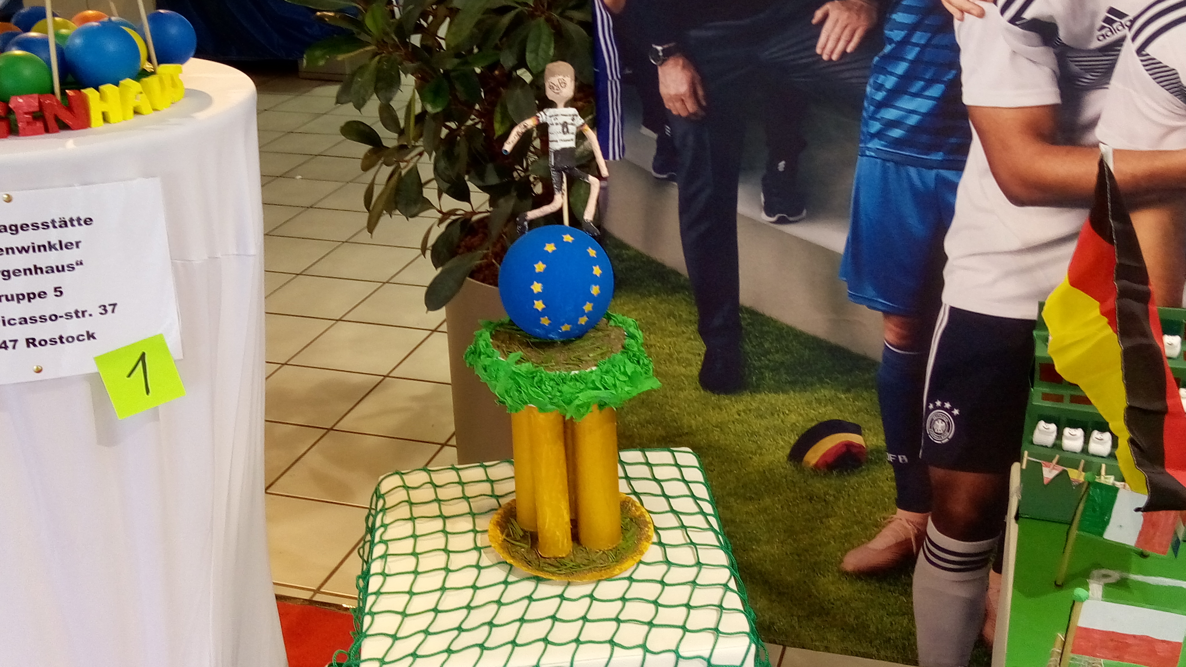 Die alljährliche Schulranzen-Messe hat wieder ihre Tore geöffnet. Ein fester Bestandteil dieser Messe ist ein Bastelwettbewerb der Vorschüler. Hier gibt es jedes Jahr ein Thema zu welchem sich die Vorschüler kreativ austoben dürfen. Dieses Jahr war das Thema „Fußball EM 2020“. Die großen Kinder, der Kindergartengruppen, unserer Kita haben zusammen mit den Erziehern beschlossen einen Pokal mit Fußballspieler zu gestalten. Mehrere Wochen arbeiteten sie an dem Gerüst und der Gestaltung. Gemeinsam beschlossen die Vorschüler und Erzieher den Spieler auf dem Pokal nach dem Fußballspieler Toni Kroos zu gestalten, da dieser unter anderem auch für den FC Hansa spielte.