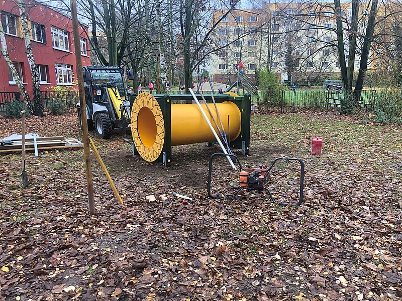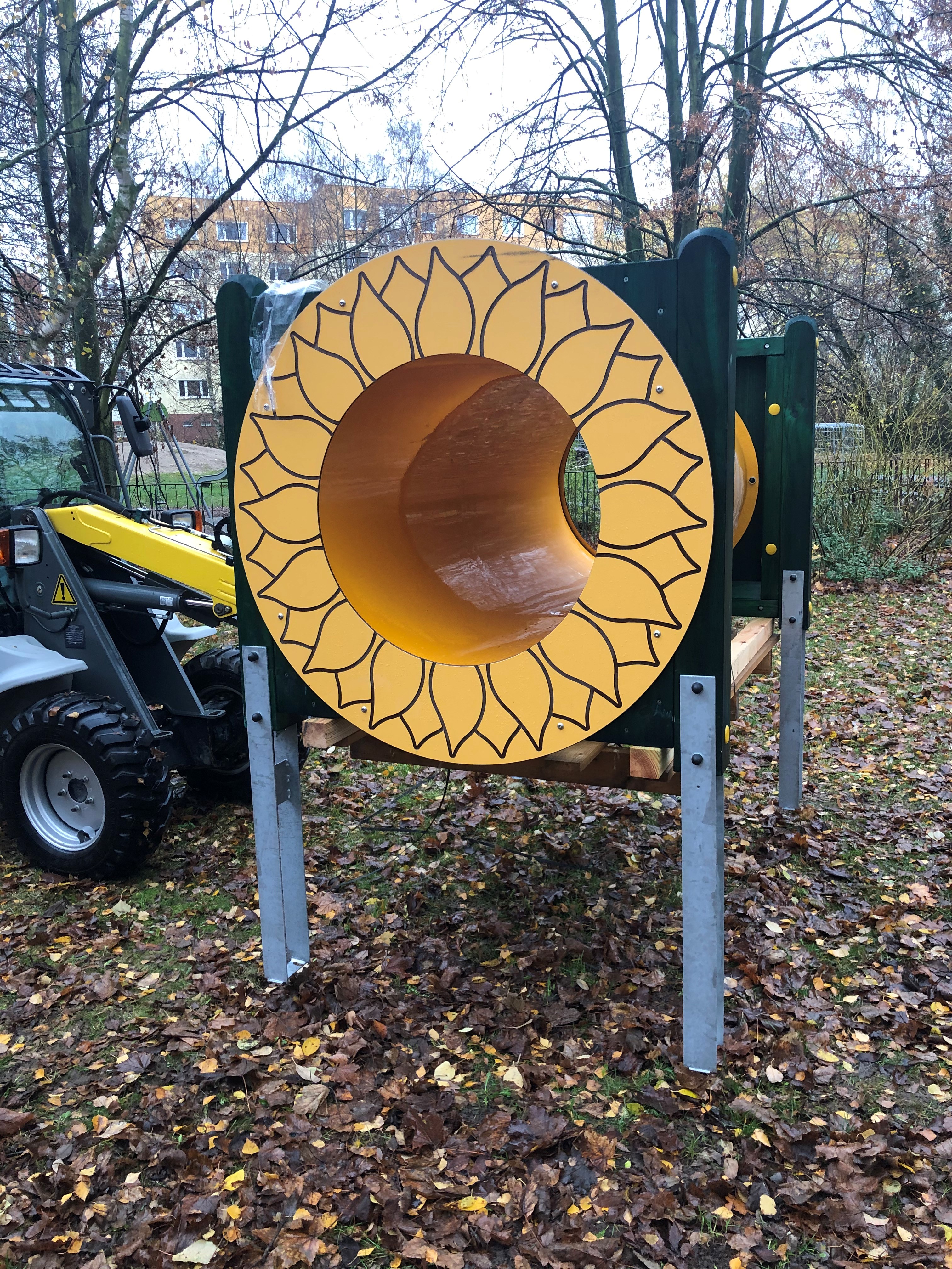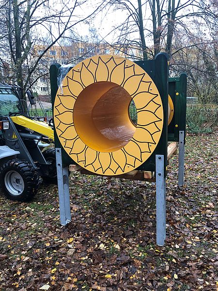 Schon seit Ende des letzten Jahres ziert ein neues Spielelement den Außenspielbereich unserer Krippenkinder. Ein neuer Kriechtunnel lädt nun zum Verstecken, Krabbeln und Toben ein. Schon von weitem ist er mit seiner sonnengelben Farbe zu erkennen und ähnelt durch Aufkleber an seinen Enden einer Sonnenblume - unser Name bleibt also Programm und so passt er ganz ausgezeichnet zu uns.