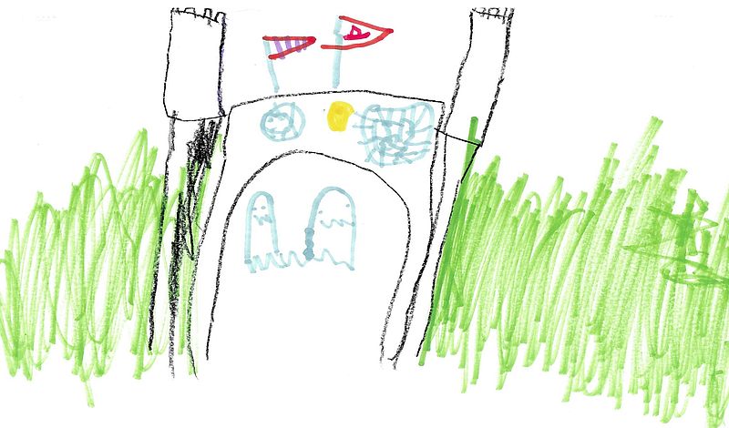 Dort in der Ecke der Gefängniszelle lag ein kleiner Teddy. Plötzlich wurde er lebendig, stapfte los und befreite die Geister. Sie waren so froh und glücklich, dass sie den Ritter, der den langen Flur entlang ging, völlig übersahen. Es kam wie es kommen musste, der Ritter erwischte sie und sperrte alle wieder zurück ins Gefängnis. Auch den kleinen Teddy, weil er den Geistern geholfen hatte.