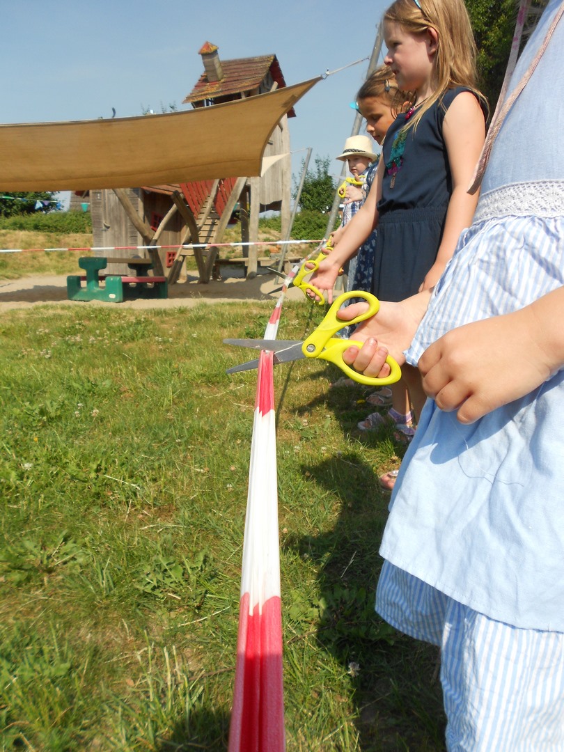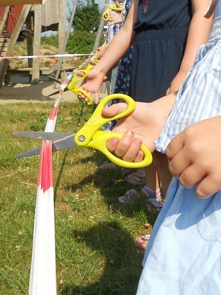 Am 01. Juni war es endlich soweit. Nach 28 Tagen konnten die Kinder endlich unser neues "Tipi" auf unserem Außengelände erklettern. Nachdem alle mit Musik und ihren Kindertagsstöckern durch unser schönes Poppendorf gewandert sind, kamen wir in der Kita an. Alle versammelten sich um das "Tipi". Unsere Vorschulkinder bekamen dann jeder eine Schere und sie durften das Absperrband durchschneiden. Danach mussten alle Kinder helfen, die große Schleife (die um das Tipi gebunden war) zu öffnen. Die Kinder waren sehr glücklich und entdeckten unter dem Tipi noch neue Besen, ein neuen Kegel und ein neuen großen LKW.