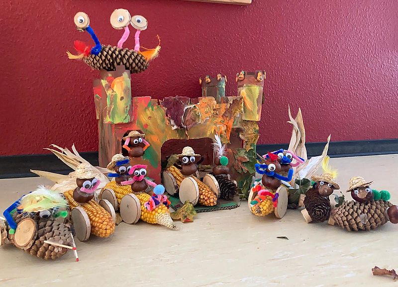 Die Idee war ein kreatives Werk zum Thema "Herbst" zu gestalten. Und was liegt da näher, als mit Naturmaterialien, bunter Farbe und ganz viel Kreativität und Ideenreichtum der Kinder eine "Kinderburg" herbstlich zu gestalten.