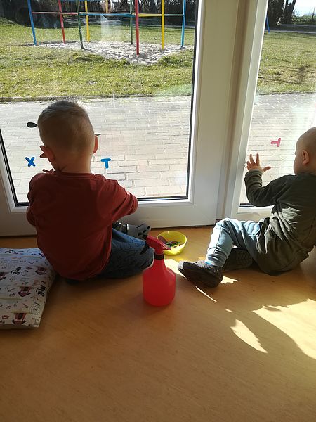 Wasser an die Scheibe sprühen und mit Moosgummiformen gestalten. Das geht kinderleicht und fördert die Kreativität, wie die Geschwister M. und J. beweisen.