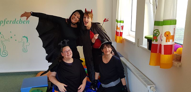 Alle großen und kleinen Gespenster feierten am 30.10. das Halloweenfest. Im Vorfeld wurde viel gebastelt und unsere Kita geschmückt. Kleine Geister, viele Spinnennetze mit Spinnen und Kürbisse wurden verziert und aufgehängt.