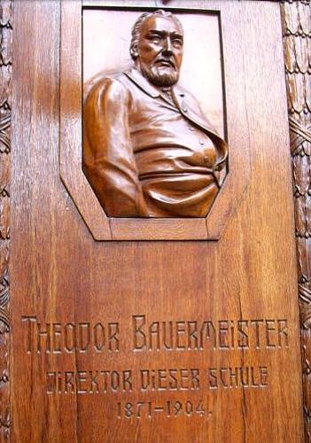 Geboren wurde Theodor Bauermeister am 28.07.1834. Sein Vater, Pastor der Gemeinde in Hammenstedt, östlich von Northelm in Hannover, unterrichtete ihn selbst bis Theodor dann sein 7-jähriges Studium in Theologie auf einem Gymnasium in Göttingen aufnahm. Er machte dort auch seinen Abschluss und trat in Röbel sein Lehramt an. Er unterrichtete wissenschaftliche Bereiche, aber mit Vorliebe Deutsch und Französisch. Dann folgten 2 Jahre an einem Gymnasium in Wismar, bis ihn dann der gute Ruf der "Großen Stadtschule" erreichte und ihn nach Rostock lockte. Der Tag, an dem er sich dann mit dem Bürgermeister der Stadt Ribnitz, Reinhold Nizze traf, sollte historischen Wert für Ribnitz erlangen. Zum damaligen Zeitpunkt war es für Ribnitz schier unmöglich geworden unter den gegebenen Möglichkeiten, alle schulpflichtigen Kinder an dieser einen Schule zu unterrichten. Zusammen schafften es Bauermeister und Nizze, hervorragende Ideen zum Umbau der Schule zu verwirklichen und unter äußerst hohem Engagement und Aufwand, ließen sie ein neues Gymnasium von 1872 bis 1874 errichten. Im Eingangsportal dieser neuen, großartigen Schule, ließ Bauermeister in großen Lettern die Inschrift: "SALUS SCHOLAE SALUS CIVITATIS!" |