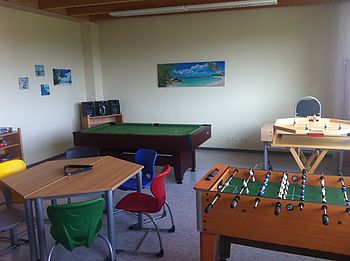 Der Freizeittreff ist mit unseren Schülern der 5. und 6. Klassen eingerichtet worden. Hier können sie ihre Freizeit verbringen. Es gibt die Möglichkeiten Billard, Dart oder Gesellschaftsspiele zu spielen, Musik zu hören, sich zu treffen, zu reden oder sich auszuruhen. Zum Lesen und Entspannen lädt auch die große Couch mit kleinen Sitzelementen ein.