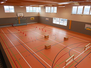 Unsere Sporthalle ist für die Nachmittagskurse natürlich auch verfügbar. Die vielen großen Fenster sorgen für eine helle, angenehme Wettkampfatmosphäre. Die Angebote für die Kinder gehen von Leichtathletik, Handball, Fußball, Turnen, Tischtennis bis hin zu Hockey.
