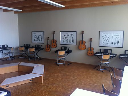 Der Musikraum beherbergt unsere beliebten musikalischen Kurse Gitarre und Keyboard. In ruhiger Atmosphäre und kleinen Gruppen kann das Interesse für das Instrument geweckt oder vorhandene Fähigkeiten ausgebaut werden. Darüber hinaus wird der Raum als Ruhe und Entspannungsort für unsere Saunakurse genutzt.