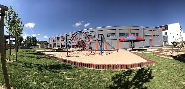 Im hinteren Bereich des Außengeländes befindet sich unser Spielplatz. Der große Sandkasten steht zum Graben und Burgen bauen bereit. Darüber hinaus lädt unser vielfältiges Klettergerüst jedes Kind zum Rutschen und Hangeln ein.