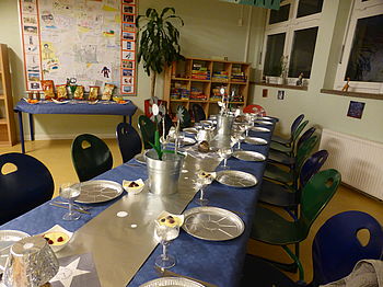 Der Bücherwurm hat uns zu seiner Übernachtungsparty in die Schule eingeladen. Die Kinder hatten eine Menge Spaß und konnten sich zum Abendbrot den Bauch mit Buchstaben "vollhauen". Anschließend ging es im Musikraum kreativ weiter, mit Limbo, Sprachchoreo und Büchertanz. Noch bis in die Nacht feierten die Kinder gemeinsam mit dem Wurm. Die Presse war wie auf den nachfolgenden Fotos zu sehen auch mit von der Partie.
