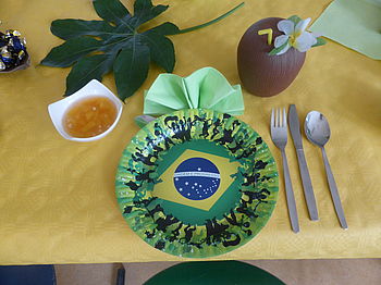Samba de Janeiro lautete das Motto am 1.Juli. Nach einem Flug nach Brasilien checkten unsere kleinen Gäste in unser sonniges Hotel ein. Nach einem typisch brasilianischen Buffet mit Chili con carne, Südfrüchten und feurigen Chicken Wings, ging es an die Copacabana, wo unsere kleinen Künstler ihre Tassen mit südländischen Motiven verzierten. In der lauen Sommersonne ließen wir den Abend am Feuer ausklingen. Am nächsten Morgen hieß es Hasta Luego Brasilien nach einem tollem Abend unter der Sonne Brasiliens.