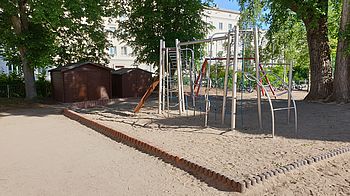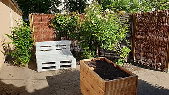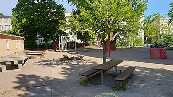 Auf unserem Freigelände laden eine Tischtennisplatte, ein Klettergerät, ein Basketballkorb, Fussballtore, mehrere Sitzgruppen und verschiedene Bepflanzungen zu vielseitigen Betätigungen ein.
