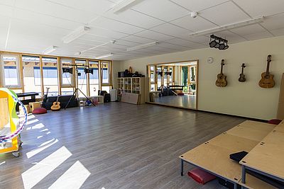 Und sonst so? Matten für Yoga und Akrobatikpyramiden, unzählige Kostüme, Schminke, Musikinstrumente und ganz viel Spaß warten auf euch im Tanz- und Theaterraum.
