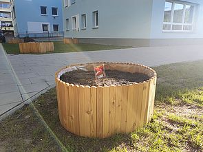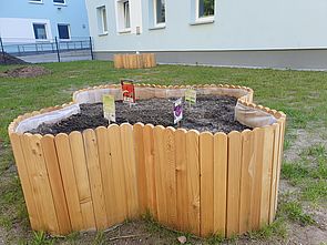 Unsere Hochbeete stehen auf dem ganzen Hof verteilt. Hier pflanzen wir gemeinsam mit den Kindern frische Kräuter und Gemüse an.