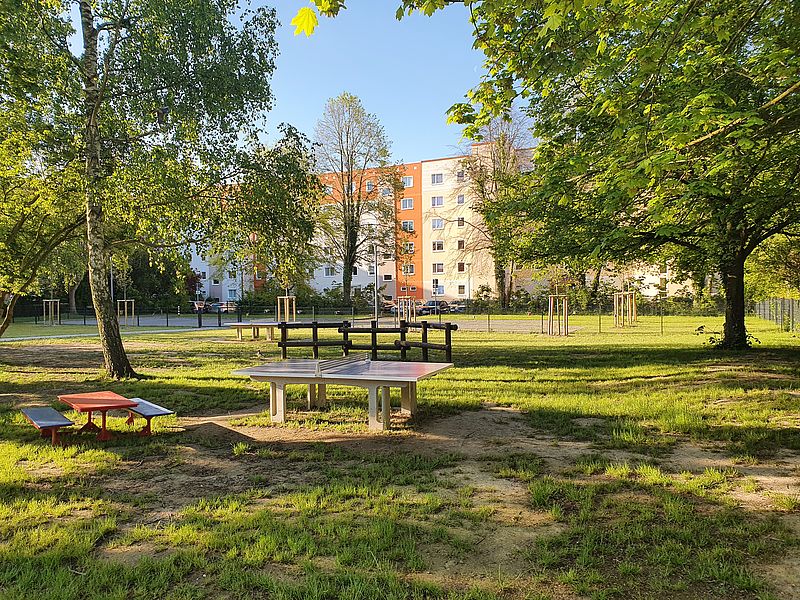 Unsere 2 Tischtennisplatten stehen besonders schön im Schatten großer Bäume, damit auch im Sommer fleißig weiter gespielt werden kann.