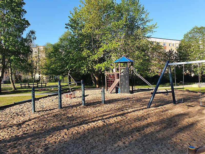 Umrundet von einer großzügigen Sandkiste befindet sich unser Klettergerüst, dieses bietet ausreichend Platz zum Kletter, rutschen und verstecken. Ebenso ist hier eine Schaukel zu finden.