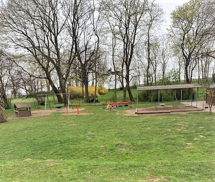 Weiterhin finden die Kinder vielfältige Versteckmöglichkeiten, so zum Beispiel einen großen Kriech- und einen Weidentunnel. Das Holzhaus und die zwei Schaukeln runden das Gesamtbild des Hofes ab.
