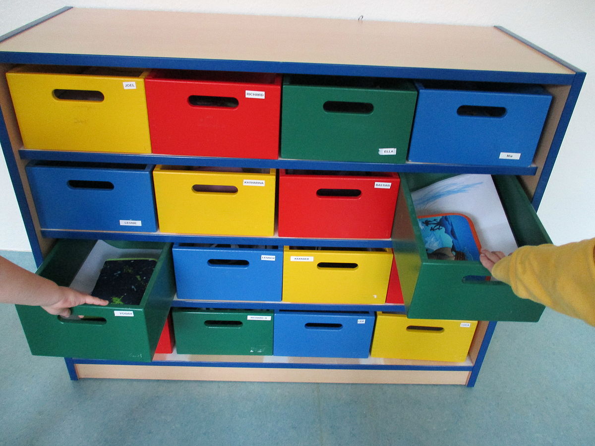 In die besonders ausgestatteten Räumlichkeiten (mit Kinderküche = selbst beim Kochen und Backen tätig werden, oder Bad mit Werkbank = handwerklich geschickter Umgang mit echten Werkzeugen erlernen) wechseln alle zukünftigen Schulanfänger. Das ist die erste Besonderheit diesen letzten Kindergartenjahres. Was nicht bedeutet, dass wir die vorschulische Bildung auf das letzte Jahr vor der Schule reduzieren. Trotzdem sind die "Großen" immer noch einmal etwas Besonderes. Durch die Raumausstattung und das didaktische Spielmaterial wird bei Ihnen die Neugierde auf die Lerninhalte der Schule ganz intensiv geweckt. Schon 1/4 Jahr nachdem sie ihre Räumlichkeiten in Besitz genommen haben, erhalten Sie die Einladung in die Grundschule zum Einschulungstest. Diese Zeit ist aufregend, nicht nur für die Kinder. Auch den Eltern wird in dieser Phase bewusst, dass aus Ihren "Kleinen" nun baldige Schulanfänger werden. Den Kindern steht außerdem ein Schrank mit eigenem "Schulfach" zur Verfügung. Dieses personalisierte Fach beinhaltet Federtasche, Hefter, Tuschkasten, Pinsel sowie eine Schere. Ebenfalls erstellt die jeweilige Erzieherin mit den Kindern ein eigenes Übergangsportfolio. Dieses beinhaltet Beiträge vom Kind, Beiträge der Eltern und Beiträge der Erzieherin. Am Tag der offenen Tür der Grundschule werden diese dann von den Kindern übergeben. So können sich die Lehrerinnen ein kleines Bild über Ihre zukünftigen Schüler machen.