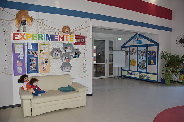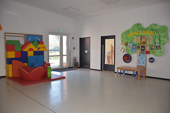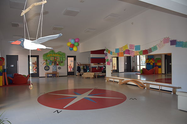 Das Haus sorgt mit seinen großen Fenstern für helle, freundliche Räume und bietet Gelegenheit zum Hinein- und Herausschauen. Das Herz unserer Kita ist die große Halle, die die beiden Gebäudeteile Krippe und Kindergarten miteinander verbindet. Dieser großzügige Raum garantiert ausreichend Spiel- und Bewegungsmöglichkeiten für die Kinder und ist Markt und Treffpunkt für alle Kindergruppen, Eltern und Besucher des Hauses.