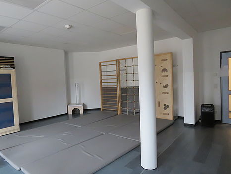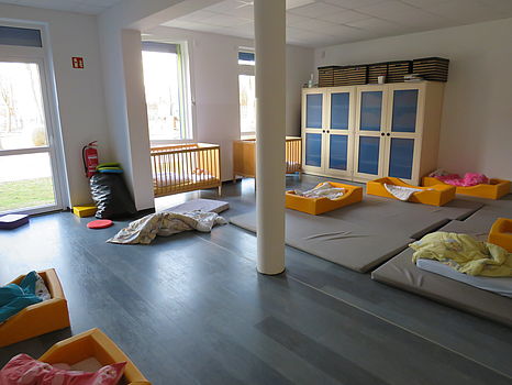 Ein großer Schlafraum für die Krippenkinder kann im laufenden Kitaalltag auch als Sinnes- und Bewegungsraum umfunktioniert werden. Zur Schlafenszeit können die 0-3-Jährigen sowohl in Gitterbettchen, als auch in Nestchen oder auf Matten ihre Ruhe finden. Elektrische Rollos ermöglichen es uns diesen Raum komplett zu verdunkeln.