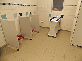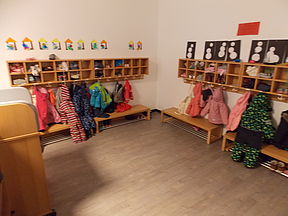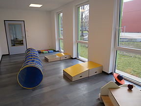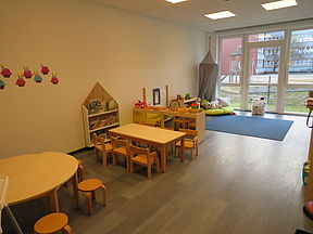 Zwei altersgerechte ausgestattete Krippenräume werden durch einen gemeinsamen Sinnesraum und ein Bad verbunden. Spielmaterial zum Erkunden, Bauen, Beobachten und Fühlen bieten die Chance auf neue Lern- und Erfahrungsprozesse. Das Bad ist mit großem Waschbecken, kleinen Toiletten und einer Doppelwickelkommode ausgestattet.